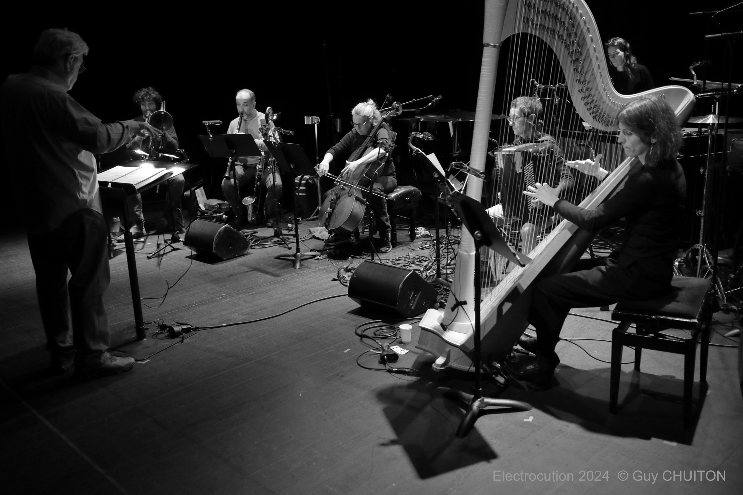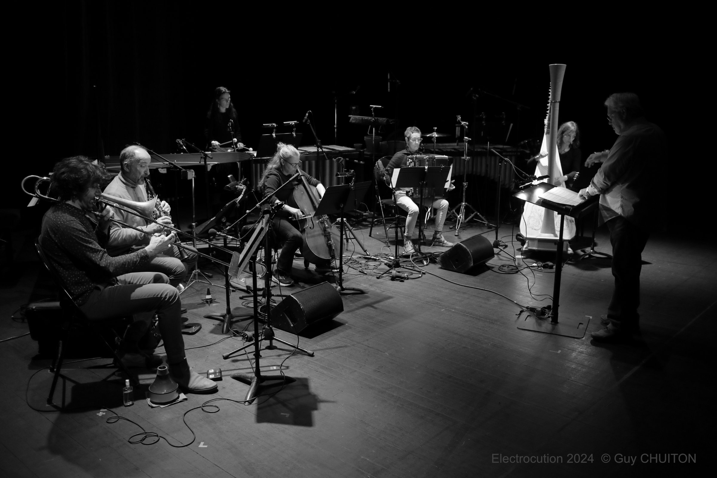 The musicians of the Ensemble Sillages who premiered the piece include: Jean-Marc Fessart, Clarinets; Hélène Colmbotti, percussion; Aida Aragoneses, harp; Vincent Leterme, midi keyboard; Céline Rivoal, accordion; Danielle DeGruttola, guest improvising cellist; David Milnes, Conductor, Edmund Campion, electronics.